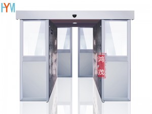 自动平移门货淋室为了减少人员及货物进出带来大量尘埃粒子,经高效过滤器后的洁净气流由可旋转喷嘴从各个方向喷射至人和物品上,有效而迅速清除尘埃粒子,清楚后的尘埃粒子再有处、高效过滤器后重新循环到风淋区域内。